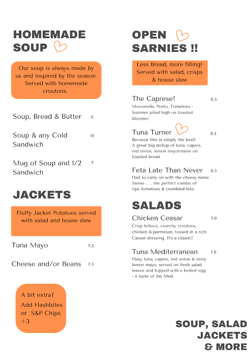 For those craving a light bite, the Jackets section features comforting classics like Tuna Mayo and Cheese And/Or Beans, perfect for a quick, filling snack. If you're in the mood for a salad, the Chicken Caesar and Tuna Mediterranean salads offer a refreshing and wholesome option.