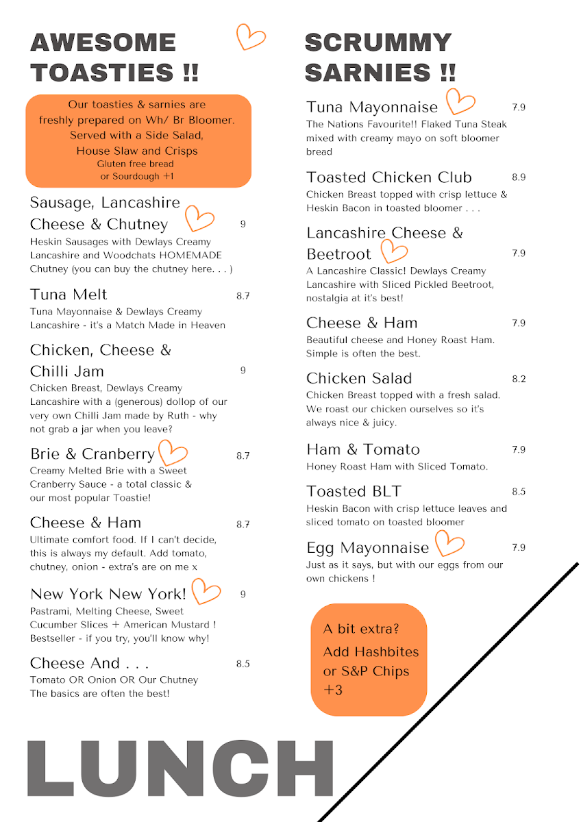 The Awesome Toasties range from the savory Sausage Lancashire and Cheese & Chutney to the comforting Tuna Melt, Brie & Cranberry, and Cheese & Ham. For those who prefer sandwiches, the Scrummy Sarnies provide great options such as Tuna Mayonnaise, Toasted Chicken Club, and Lancashire Cheese & Beetroot, along with favorites like Chicken Salad and Cheese & Ham.